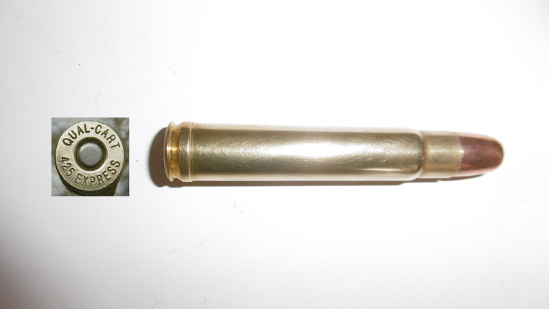 eine Deko-Patrone .425 Express ( QUAL-CART 425 EXPRESS ) eines aus der Reihe der A.Square-Kaliber. Quality-Cartridge stellt ehemalige wildcats als Kleinserie mit korrektem Kaliber im Bodenstempel her. Patrone ist ohne Ladung, zum Nachweis ist eine Klapper-Kugel eingelegt.