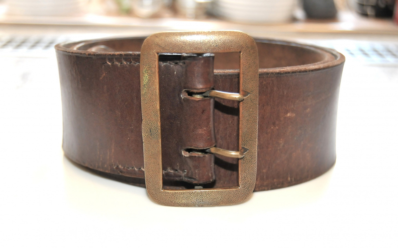 Leder: sehr kräftiges 3-4 mm dickes Leder mit Tragespuren, aber ohne Schaden. Elf Paar originale, dazu eines nachträglich per Hand angebracht, Schnall Löcher. Stempelung: Croupon 895. Innen eingekratzt: „Heinz Trapkowski“. Nähte fest.