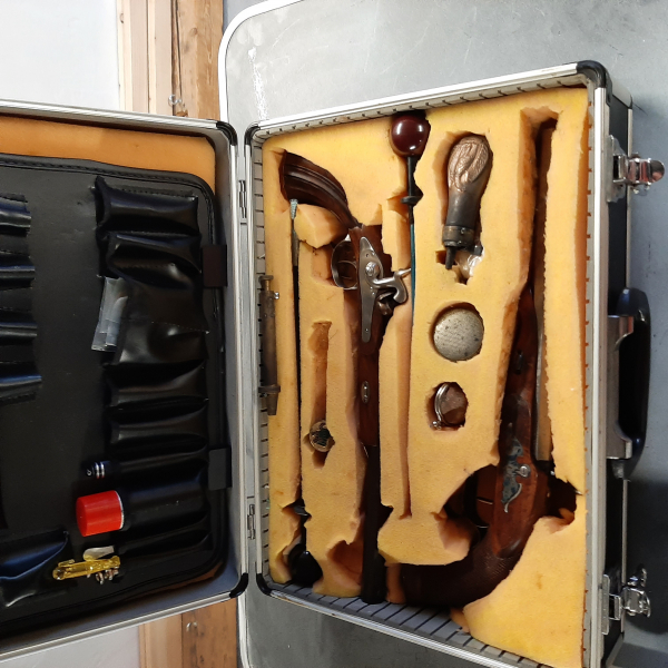 Waffenkoffer mit zwei unterschiedlichen Pistolen (1x Mang, 1x Pedersoli), Zubehör und Zustand siehe Bilder. Koffer ohne Schlüssel, Die Waffen sind mind. 15 Jahre nicht benutz worden,