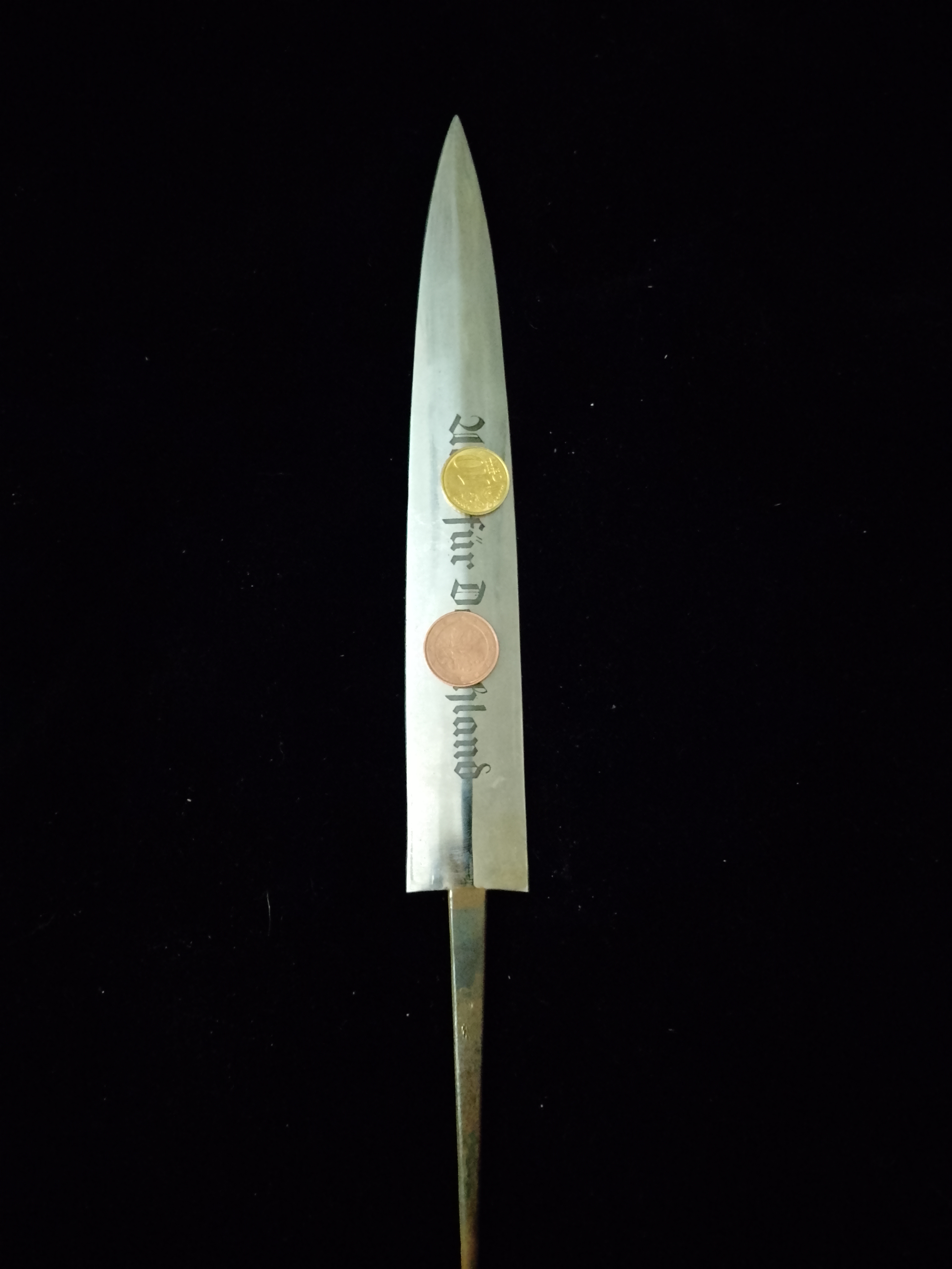 Vorderseitige Ätzung mit Motto der Sturmabteilung rückseitig eine Sonderwittmung Hersteller Herder Solingen, geschlagener Angel mit vorne Ziffern 12 versehen, rückseitig erhaben Schmiedemarke A12 entspricht so der Fachliteratur.