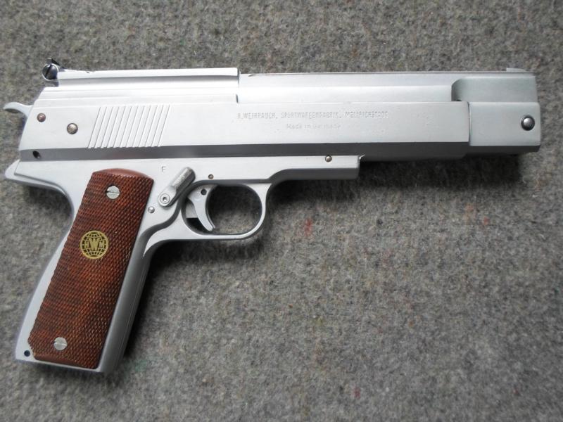 Luftpistole Weihrauch HW 45, Kaliber 4,5 mm / .177. Made in Germany. F im Fünfeck. Sehr kompakte Baugröße für eine Luftpistole, im Design einer der berümtesten Gebrauchspistolen nachempfunden. Matchähnlich verstellbarer Druckpunktabzug mit manueller Sicherung. Fein einstellbares Mikrometervisier, Holzgriffschalen. Gewicht 1150 g, Länge 278 mm, Höhe 160 mm.