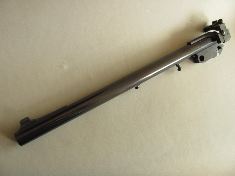 Neuwertiger Wechsellauf für die Thompson Center Contender Pistole im Kaliber .30-30. Der Lauf wurde vermutlich noch nie geschossen und befindet sich daher in einem tadellosen Zustand. Die Schlieren auf der Laufoberfläche sind durch Reflexionen beim Photographieren entstanden. Der Lauf hat eine schöne, gleichmäßig schwarze Oberfläche. Die Länge des Laufes incl. Patronenlager beträgt 350 mm.
