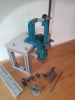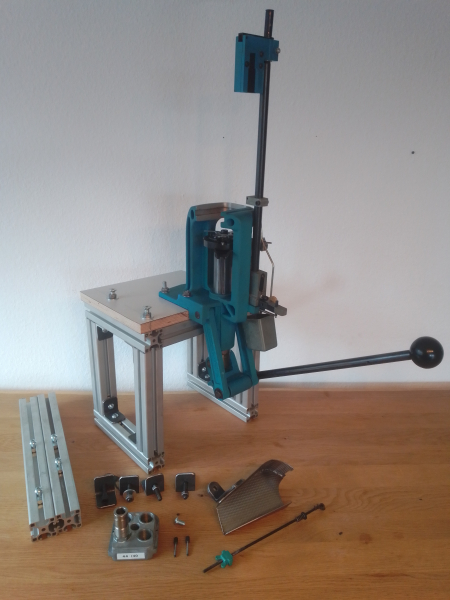 Sie ist auf einen Sockel aus Aluminium Profil geschraubt und kann somit mobil und kompakt aufgebaut werden. Anpassungen und Umbauten sind dadurch auch spielend einfach möglich. Zu der Presse gehört ein Toolhead mit Aufnahme für einen Pulverfüller, sowie ein Conversion kit für das Kaliber.44-40 WCF.