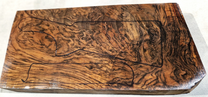 Die ersten Fotos wurden auf einem leicht feuchten Holzstück aufgenommen, um die Farben besser sichtbar zu machen. Das letzte Foto zeigt die Maße in Zentimetern. Die Umrisse entsprechen den tatsächlichen Abmessungen der Blaser F3. Die Stücke wurden über fünf Jahre luftgetrocknet. Sie wurden nicht dampfbehandelt, um die Farben und Kontraste des Tscherkassy-Nussbaums zu erhalten. Sie wurden gegen Holzwürmer und Insekten behandelt.