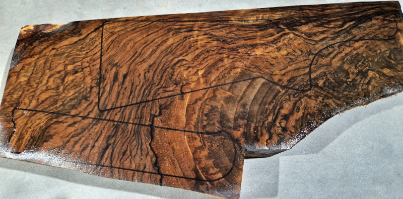 Die ersten Aufnahmen entstanden auf einem leicht angefeuchteten Holzbrett, um die Farben und die Schönheit des fertigen Produkts realistischer darzustellen. Das letzte Bild zeigt die Maße in Zentimetern. Die Konturen wurden auf die tatsächlichen Abmessungen der Blaser F3 übertragen. Die Teile wurden fünf Jahre lang luftgetrocknet. Auf Dampftrocknung wurde verzichtet, um die Farben und die natürlichen Harze des Holzes zu erhalten. Das Ergebnis ist ein elastischerer, festerer und schönerer Schaft