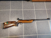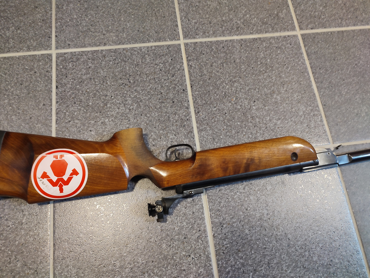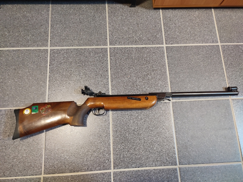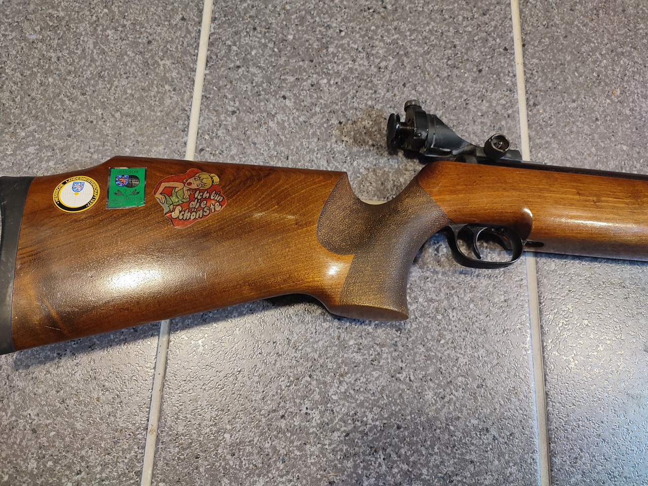 Aufgrund von Zeit- und Platzmangel muss ich meine Luftgewehrsammlung nun endgültig auflösen, als erstes müssen die nicht mehr funktionsfähigen Gewehre gehen. Angeboten wird ein älteres Walther LGV Luftgewehr in klassischer Ausführung mit Holzschaft. Aufgrund seines Baujahres vor 1970 verfügt es noch nicht über ein F im Fünfeck. Das Gewehr verfügt über ein Laufgewicht sowie eine sportliche Visierung mit Korntunnel und Diopter. Die Verstellung des Diopters ist leichtgängig Der Schaft zeigt eine ansprechende Maserung und einen ausgeprägten Pistolengriff. Äußerlich sind ein paar Aufkleber angebraucht. Das Holz hat ein paar Dellen und Schrammen (Siehe Bilder). Das System weist ein par Flugrostspuren auf. Der Laufmantel ist dagegen noch in einem guten Zustand. Das Gewehr lässt sich zwar spannen und der Abzug lässt sich aulösen, jedoch baut es keinen Druck mehr auf, daher muss wahrscheinlich der Kolben getauscht werden.