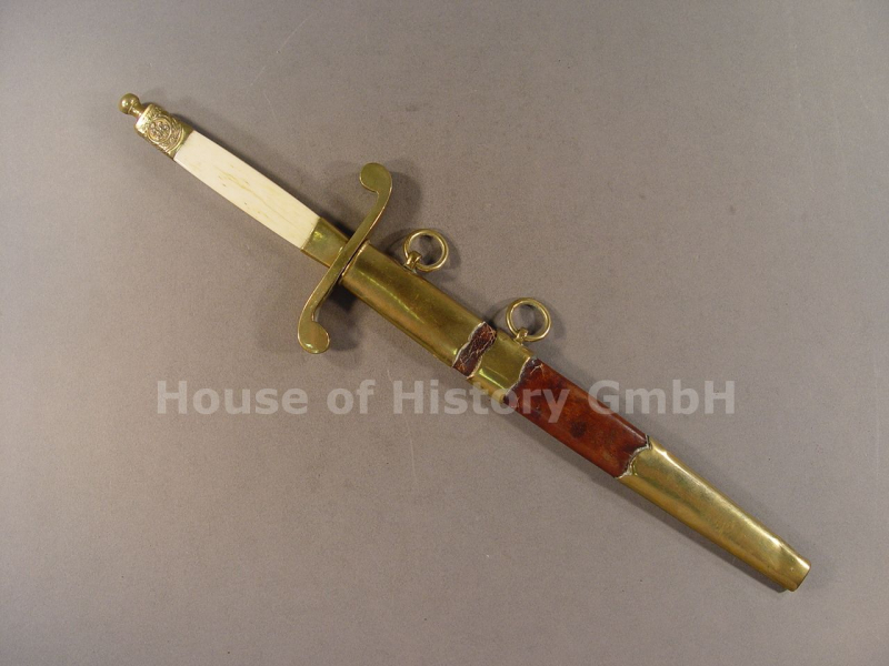 Dolch M 1914 für Offiziere der Luftwaffe und motorisierter Einheiten, flache zweischneidige Klinge mit schwer lesbarer Herstellermarke, Beingriff, Messing Parierstange und Knauf mit Zarenchiffre "H II.", braune Lederscheide mit Messingbeschlägen, Länge 35 cm, sehr schöner Zustand jedoch etwas wackelig, sehr seltener spät eingeführter Dolch