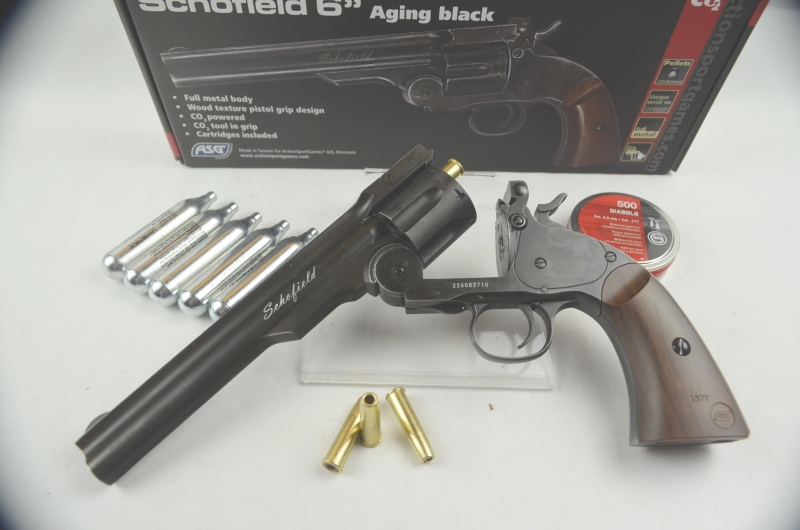 Der Single Action Kipplaufrevolver als CO² Nachbau in sehr hochwertiger Ausführung und Optik. Besonders Interessant sind die authentischen Ladehülsen, die jeweils ein Diabolo im Kaliber 4,5 mm aufnehmen.