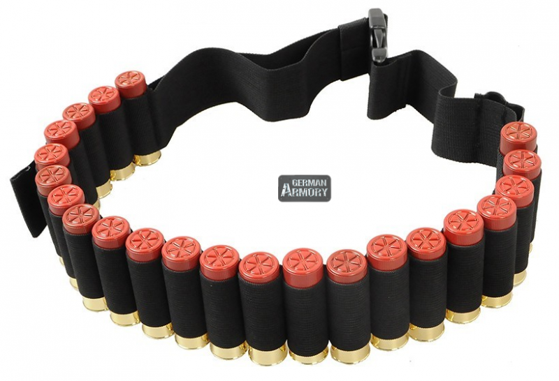Dieser Schrotpatronengürtel fasst 25 Schuss. Er besteht aus hochfestem Nylon und ist in der Größe frei verstellbar (uni size). Für Kaliber 12, 16 und 20 gedacht, alle Patronenlängen. Maximale Länge 130cm.