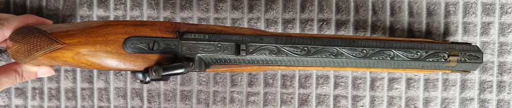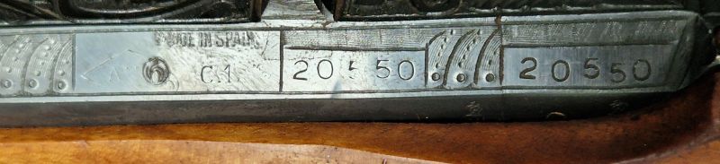 Gebläuter, achtkantiger Lauf. Cal. 11,5 mm gezogen. Oberseite fein graviert. Seitlich Seriennummer, Hersteller usw. Auf Lauf und Schwanzschraube jeweils Beschuss (X im Quadrat, darüber behelmter Ritterkopf, Eibar).