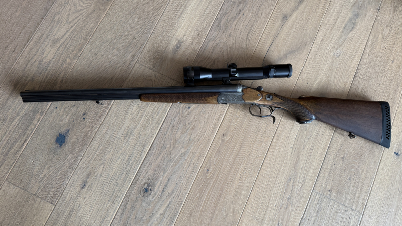 Holz ist in guten Zustand, Schließt dicht. Läufe blank. Schöne Gravur. Schaftkappe wurde von Büchsenmacher neu gemacht.
