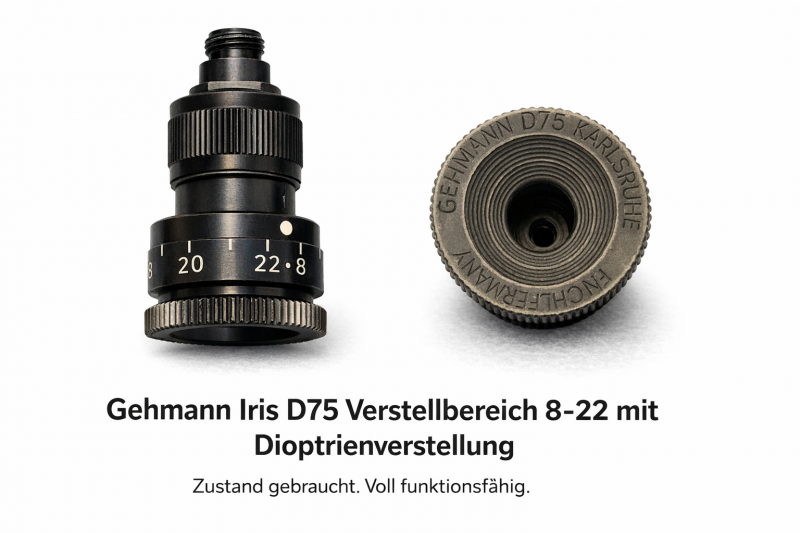 Die Gehmann Iris D75 ist eine präzise einstellbare Irisblende mit Dioptrienverstellung. (Verstellbereich Dioptrien ist nicht bekannt)
