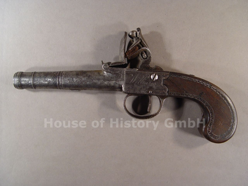 Steinschloßpistole so genannte Terzerol um 1800, Schloß funktionsfähig, Lauf abschraubbar, Eisenteile mit wenigen gravierten Verzierungen, Holzgriff mit eingelegten Silberverzierungen, Hersteller: Williams London und mit Tower Pfrüfzeichen, gesamte Länge ca.20 cm, sehr schöner Zustand mit leichten Gebrauchsspuren, dekorativ