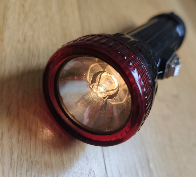 Die Lampe ist voll funktionsfähig, innen blitzblank, das Frontglas ist ohne Sprünge und sie weist nur leichte Gebrauchsspuren auf.