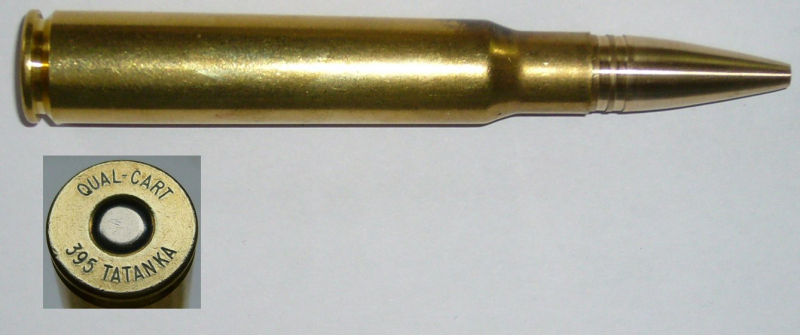 eine Deko-Patrone .395 Tatanka ( QUAL-CART 395 TATANKA ) der Besteller wollte ein Kaliber, das mittig zwischen .375 H&H Marnum und .416 Rigby liegt. Die speziellen Geschosse sind aus Massivmessing mit HP gefertigt. Quality-Cartridge stellt ehemalige wildcats als Kleinserie mit korrektem Kaliber im Bodenstempel her. Patrone ist ohne Ladung, zum Nachweis ist eine Klapper-Kugel eingelegt.