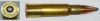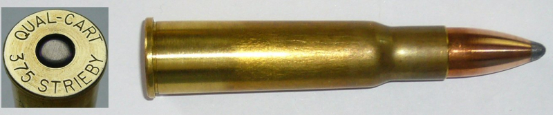 eine Deko-Patrone .375 Strieby ( QUAL-CART 375 STRIEBY ) Eigenkaliber von Ron Strieby aus Syracuse, Indiana aus .45-70 Government-Hülse. Quality-Cartridge stellt ehemalige wildcats als Kleinserie mit korrektem Kaliber im Bodenstempel her. Patrone ist ohne Ladung, zum Nachweis ist eine Klapper-Kugel eingelegt.