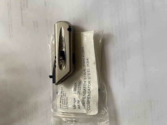 Verkaufe einen schweren Edelstahlcompensator für die Walther LP 500. Der Compensator ist neuwertig mit einem schon verbauten Compensatorkegel und allen Schrauben mit Korn. Also nur umstecken. Der Neupreis mit Kegel beträgt mitterweile knapp 300 Euro. Dies ist ein Privatverkauf und es gibt keine Garantie oder Rücknahme.