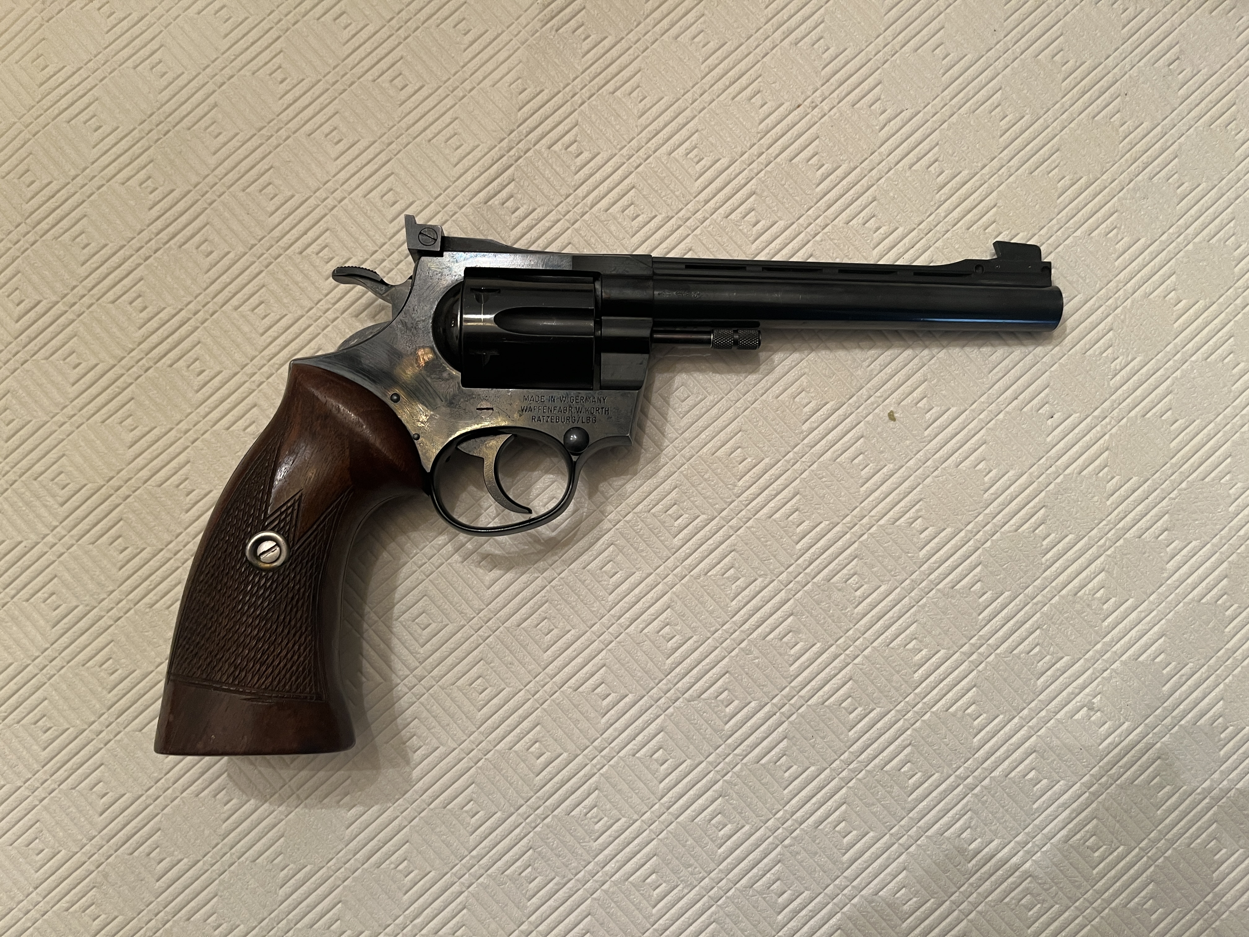 Original Korth Ratzeburg, Baujahr wohl 1963, zumindest ist ein (Beschuss?)-Stempel als 63 erkennbar. Kaum geschossen, mein Vater war eher Gewehrschütze. Eigentlich sehr guter Zustand, obige Angabe nur aus Gewährleistunggründen. Gewährleistung wird abgelehnt, idealerweise wird der Revolver abgeholt, um sich vom guten Zustand zu überzeugen. Bei Abholung besteht Rücktrittsmöglichkeit.