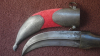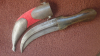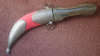 Osmanischer Krummdolch mit Scheide, 19. Jh., Stahlklinge mit beidseitig starkem Mittelgrat und auftauschiertem Silberdekor. Dunkler Horngriff. Scheide mit linienförmig silbertauschiertem Mund- und Ortblech, ergänzter roter Samtbezug, Abschluss am Ortblech überarbeitet. Das Mundblech mit 2 Trageringen. Dolch in Scheide etwas schwergängig. Gesamtlänge 30 cm. Achtung: VERSAND NUR INNERHALB DEUTSCHLANDS.