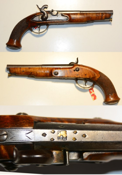 Original Perkussions-Pistole, aptiert von Steinschloss, auf dem Lauf nicht identifizierte Marke und 6 französische Lilien, seitlich am Lauf je eine weitere Lilie, eventuell höfisch, Lauflänge 18,7cm, Gesamtlänge 32,4 cm, Kaliber 12,2 mm, guter Zustand mit leichten Gebrauchsspuren