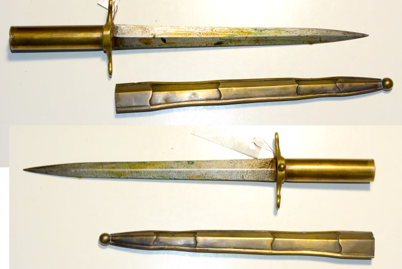 Französischer Grabendolch, Kantinenware, Klingenlänge 19,8 cm, Scheide und Griff Messing, es fehlt der Griffknauf