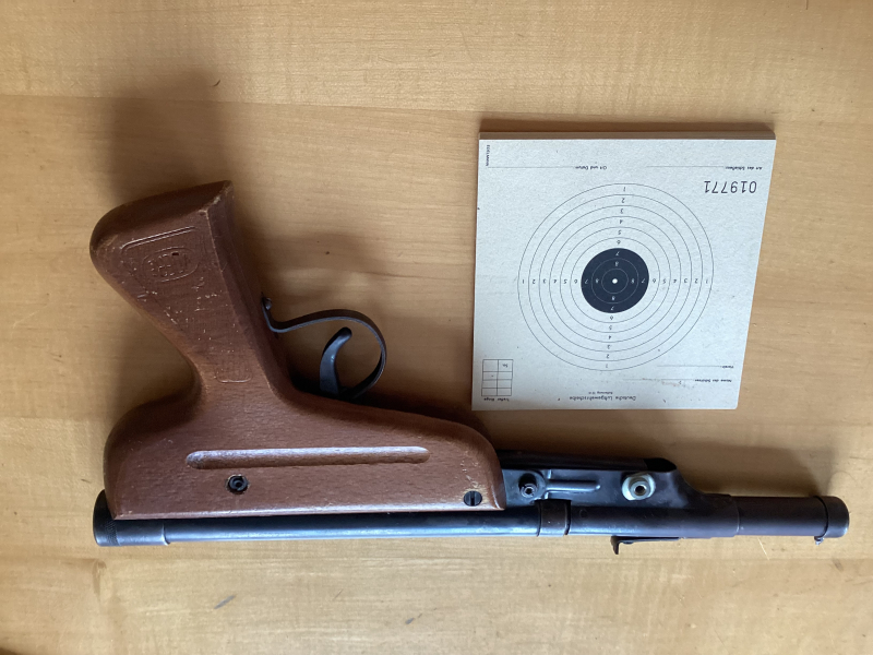 Verkaufe eine funktionstüchtige Luftpistole,mindestens 50 Jahre alt.Gut erhalten,leichte Gebrauchsspuren.Korn ist leider abgebrochen,aber schraubbar.Auf dem Metall steht „BURGO“,auf den Griffschalen VOERE.Privatverkauf,keine Garantie,keine Gewährleistung,keine Rücknahme.Kann auch abgeholt werden.Artikelstandort ist 95030 Hof.