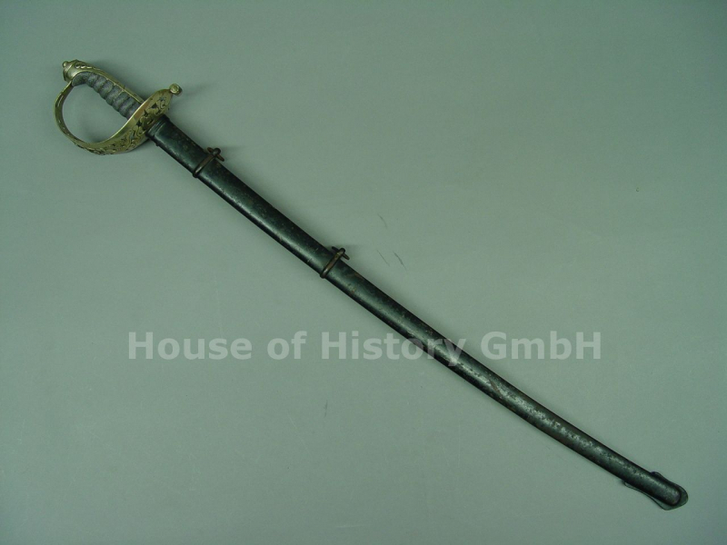 KÖNIGREICH HANNOVER Säbel Modell 1852 für Offiziere der Fußtruppen um 1860, Gefäß aus Neusilber, Korb durchbrochen gearbeitet mit floralen Mustern und zentral vorn das Herscherchiffre "GR V" unter Königskrone, oben mit Einstich für das Portepee, Rochenhautgriff mit fehlender Drahtwicklung, Fingerschlaufe entfernt, leicht geschwungene Klinge, an der Wurzel ca.29 mm breite und 81,5 cm lange Klinge, mit beidseitiger Hohlbahn, mittig beidseitig geätzt mit Rankenverzierung und dem Herrscherchiffre "GR V" unter Königskrone, terzseitig Marke nach englischem Vorbild, auf dem Rücken mit Marke "Eisenhauer", Klinge mit Hersteller "J.G.Rohden Solingen", saubere minimal gedunkelte Klinge, originale schwarz lackierte Stahlscheide mit zwei Ringbändern und zwei beweglichen Trageringen, am Mundblech fehlt eine der zwei Schrauben, Gesamtlänge 99,5 cm, ungereinigter sehr schöner Originalzustand, sehr seltener Säbel des extrem seltenen Hersteller J.G.Rohden aus Solingen