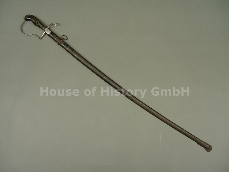 Heeres Unteroffiziers / Mannschaftssäbel, Gefäß silbern, Hersteller: Puma / Solingen, Scheide mit schwarzem Originallack noch zu ca.40 % erhalten, unteres Drittel der Klinge abgebrochen und fehlt, Griff vollständig intakt, Gesamtlänge 103 cm, getragener Zustand, seltener Hersteller