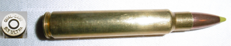 eine Deko-Patrone 9,3 Ultra Mag ( QUAL-CART 9.3 ULTRA ) aus .300 Remington Ultra Mag entwickelt. Quality-Cartridge stellt ehemalige wildcats als Kleinserie mit korrektem Kaliber im Bodenstempel her. Patrone ist ohne Ladung, zum Nachweis ist eine Klapper-Kugel eingelegt.