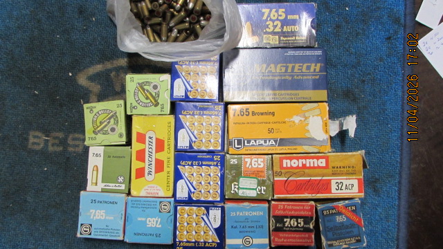 Sie bieten auf ein Munitionskonvolut im Kaliber 7,65mmBrowning; der Lieferumfang entspricht der Abbildung. Es ist möglich, dass vereinzelte Patronen bereits Lagerspuren haben, einzelne Packungen sind nicht voll und wir können auch nicht ausschließen, dass zwischendurch eine Patrone mit einem anderen Geschoss/Körnung dazwischen ist als auf der Packung steht. Bitte keine Nachfragen, welche Packungen voll sind und welche angebrochen; wer das wissen möchte, kann gerne gucken kommen.