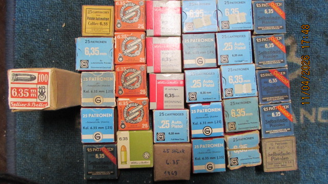 Sie bieten auf ein Munitionskonvolut im Kaliber 6,35mmBr; der Lieferumfang entspricht der Abbildung. Es ist möglich, dass vereinzelte Patronen bereits Lagerspuren haben, einzelne Packungen sind nicht voll und wir können auch nicht ausschließen, dass zwischendurch eine Patrone mit einem anderen Geschoss/Körnung dazwischen ist als auf der Packung steht. Bitte keine Nachfragen, welche Packungen voll sind und welche angebrochen; wer das wissen möchte, kann gerne gucken kommen.