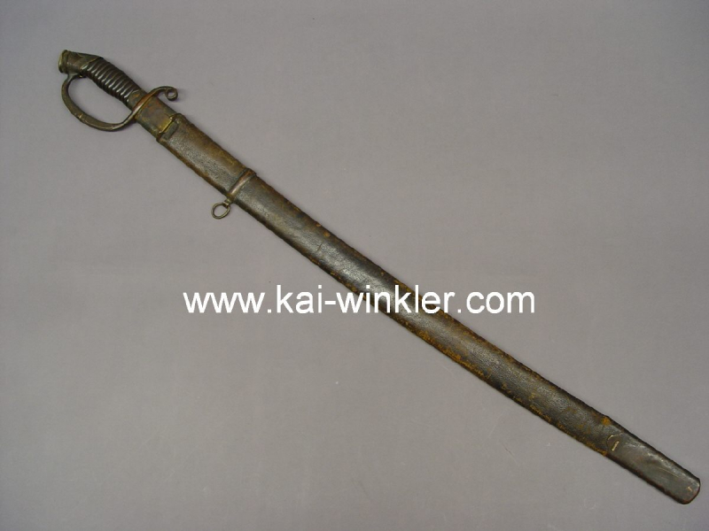 Schaschka für Offiziere aus der Regierungszeit Zar Alexander III.1881 bis 1894, leicht geschwungene beidseitig gekehlte Klinge mit zwei zusätzlichen Zügen, einseitig geätzter russischer Doppeladler mit Aufschriften, auf der Fehlschärfe mit Stempelung "II III", Messingbügelgefäss (etwas verzogen und deshalb die Schraubkappe in der Zeit mit Leder unterfüttert, läßt sich leicht richten sodaß man das Leder dann weglassen kann) mit auf der Kappe kyrillische Chiffre `A III.`, dunkelbrauner gerillter Kunstoffgriff mit einigen Abplatzungen, dunkelbraun belederte Scheide mit Messingbeschlägen und einem Tragering, Länge 98 cm, schöner unverputzter Zustand mit gewachsener Patina, extrem seltene Schaschka aus der Regierungszeit Zar Alexander III.