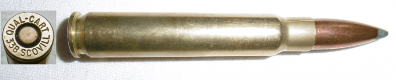 eine Deko-Patrone .338 Scovill ( QUAL-CART 338 SCOVILL ) Quality-Cartridge stellt ehemalige wildcats als Kleinserie mit korrektem Kaliber im Bodenstempel her. Patrone ist ohne Ladung, zum Nachweis ist eine Klapper-Kugel eingelegt.