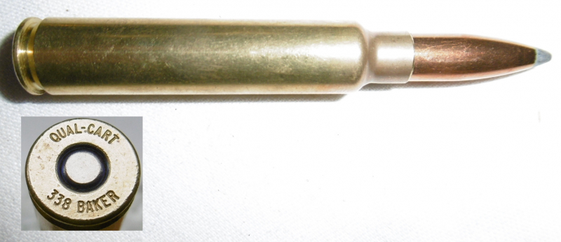 eine Deko-Patrone .338 Baker ( QUAL-CART 338 Baker ) Quality-Cartridge stellt ehemalige wildcats als Kleinserie mit korrektem Kaliber im Bodenstempel her. Patrone ist ohne Ladung, zum Nachweis ist eine Klapper-Kugel eingelegt.