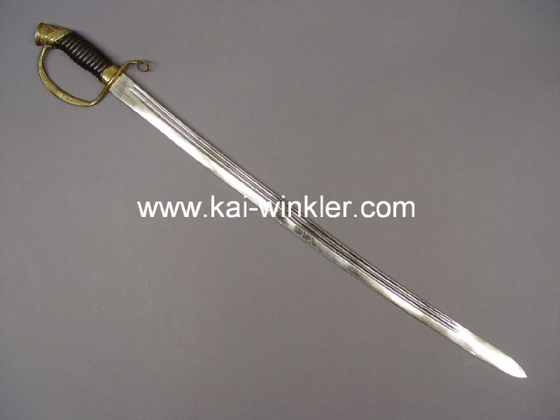 Schaschka M 1909 für Offiziere, leicht geschwungene beidseitig gekehlte Klinge mit einem zusätzlichen Zug, mit Stempelung "Solingen", Messingbügelgefäss mit auf der Kappe kyrillische Chiffre "H II.", dunkelbrauner gerillter Bakelitgriff (dieser mit Abplatzungen und gerissen), Länge 85,5 cm, ohne Scheide, schöner Zustand