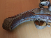 Die goldfarbene Beschichtung des Laufes im vorderen Bereich ist fast nicht mehr vorhanden, am Schaft links sind zwei Fehlstellen im Holz erkennbar, diese fallen bei Gesamtbetrachtung der Waffe aber nicht wesentlich auf ( siehe Fotos ).