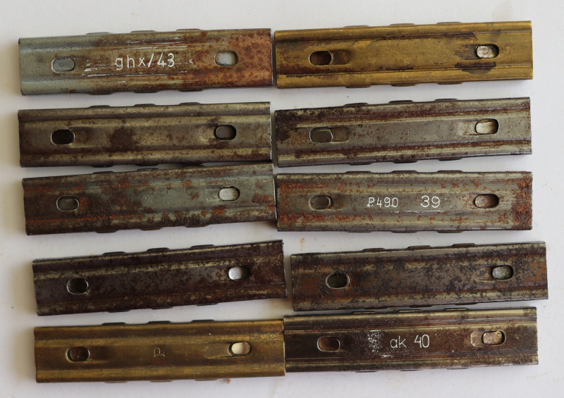 Zehn Ladestreifen mit verschiedenen Herstellerzeichen - deutsch bis 1945, Zustand siehe Bild. Nach dem EU-Recht erfolgt der Privatverkauf unter Ausschluss jeglicher Gewährleistung, Ersatz, Garantie oder Rücknahme. Der Käufer erklärt sich damit einverstanden und erkennt dies mit seinem Kauf an. Rückgabe, Rücktritt, Minderung oder Nachverhandeln sind hiermit ausgeschlossen. Privatverkauf Sammlung. Porto versichert - Ausland teurer - bitte anfragen. Kein Verkauf an Jugendliche. Achtung - Kein Verkauf nach EU Inselstaaten wegen Luftpost.