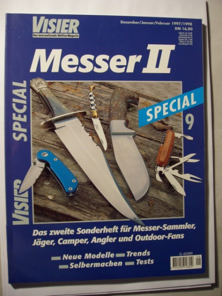 Für Schützen / Waffenfreunde und Blankwaffen-Sammler :+++ angeboten wird das VISIER - SPEZIAL Nr. 9 -- ** Messer II ** -- Das zweite Sonderheft für Messer-Sammler, Jäger, Camper, Angler und Outdoor Fans -- neue Modelle - Trends - Eigenbau - Tests ++ Es ist ein Band - mit 116 Seiten - von 1997 (sicher schon eine Rarität). +++ Das Heft ist gebraucht, befindet sich aber in einem sehr guten Zustand +++ Der Versand erfolgt als Buchsendung mit DHL (unversichert) ; die Versandkosten gelten nur für Deutschland.+++ Bieter aus dem Ausland bitte Versandkosten vor Gebot erfragen.+++ Versandrabatt möglich, sehen Sie auch meine anderen Angebote.+++ Privatverkauf, daher keine Gewährleistung, Garantie oder Rücknahme.+++ Fragen bitte mailen.