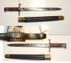 Italienisches Bajonett Modell 1891 für Carcarno-Gewehr, Hersteller "Terni", Lederscheide wie bei Modell 1870 ev. auch nicht zugehörig, denn die Klinge ist 5mm länger als Scheide, was aber auch an Lederschrumpfung liegen kann, Alters- und Gebrauchsspuren