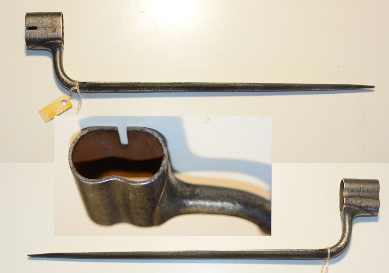 Tüllenbajonett mit 31,9cm langer Klinge und Tülle für Doppellaufwaffe, für Für Läufe mit Außendurchmesser von 17,5 mm und einem Außenabstand der Läufe von 34,5 mm, Altersspuren