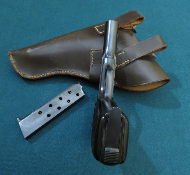 Geschichte: Nach der Entmilitarisierung am Ende des 2. Weltkriegs, wurde im Potsdamer Abkommen, der Abbau der Armeen und des Waffenarsenals im besetzten Deutschland beschlossen. Eine Ausnahme stellten dabei Polizei und sicherheitsrelevante Dienste dar. Hier bieten Sie auf eine Pistole aus der Bewaffnung einer bayrischen Bank. Seitliche Beschriftung "BAVARIAN BANKS"