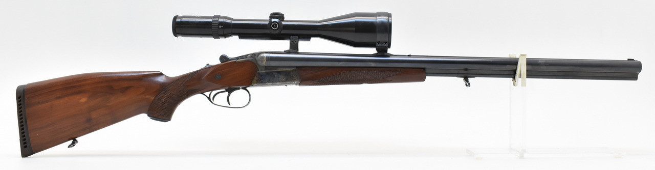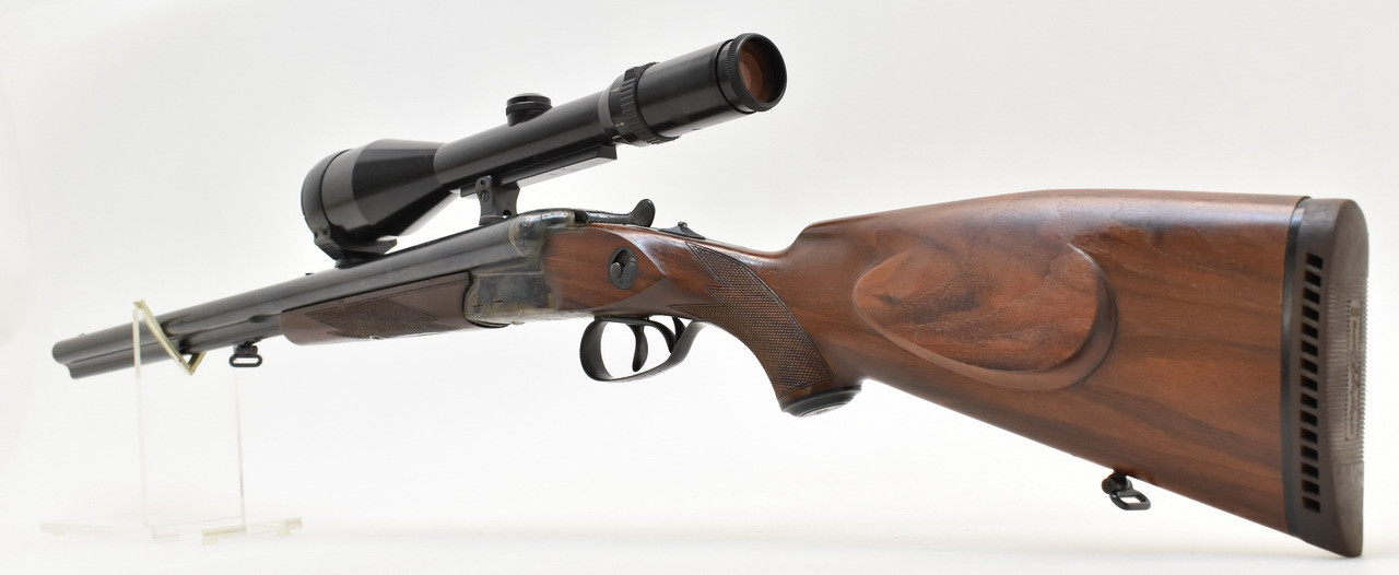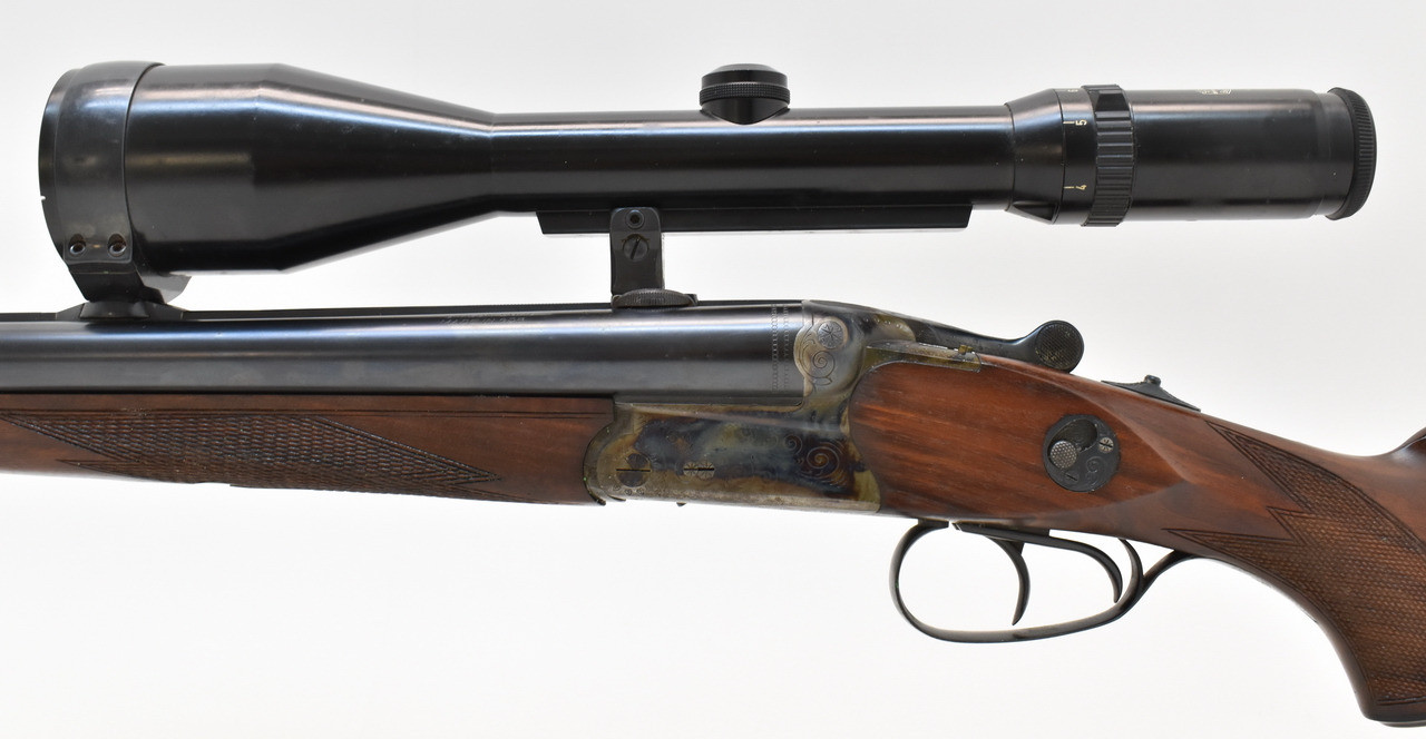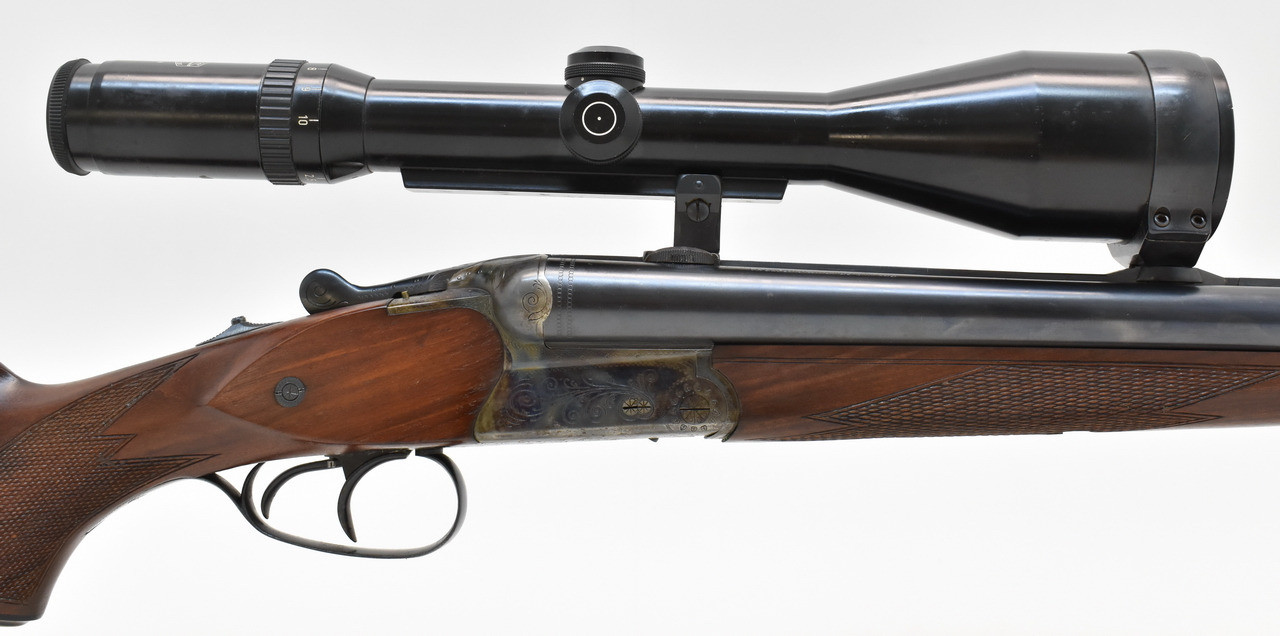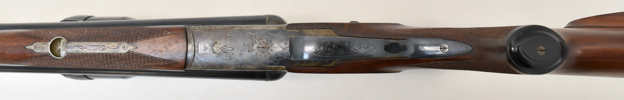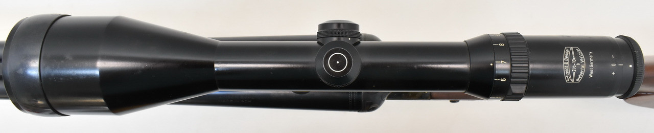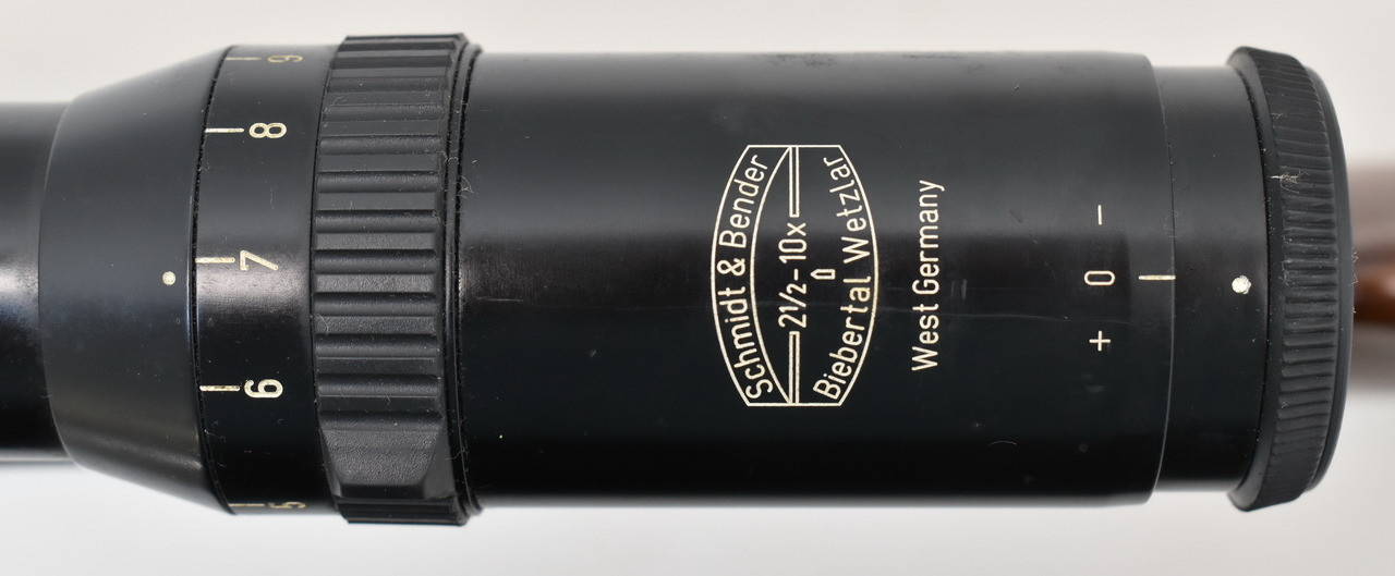 Stahlsystemkasten buntgehärtet, Rückstecher im vorderen Abzug, Signalstifte zur "gespannt" Anzeige. Spiegelblanke Läufe aus Special Gewehrlaufstahl, die Brünierung top. Die Waffe ist auf einer SEM mit einem Schmidt&Bender ZF 2,5-10x56 Abs. 1 montiert. Schaftlänge 37cm gemessen vom vorderen Abzug bis Mitte Schaftkappe. Dunkles Schaftholz ohne nennenswerte Kratzer oder Macken. Beschuss von 01/1979.