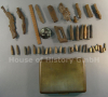 KONVOLUT von Granatsplittern, leeren Hülsen und Geschossen, Granatführungsring und Patronen Laderahmen, Mitbringsel eines deutschen Soldaten, in einer Messingdose, Größe ca. 16,5 x 12,5 x 3 cm