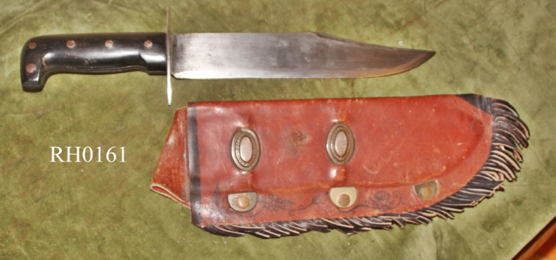 Zum Verkauf kommt im Auftrag der Erben eines verstorbenen Sammlers ein großes, schweres Messer, die Klinge und Scheide wie ein Bowie-Messer. Die Griffschalen vermutlich aus dunkelbraunem Büffelhorn. Die Klinge gestempelt: US, Herstellermarke (Bildmarke) LEGITIMUS, COLLINS & CO, Jahreszahl 1942. wohl nur wenig getragen, kaum Gebrauchspuren. Gesamtlänge ca. 38 cm, Klingenlänge ca. 24,5 cm, Klingenbreite maximal ca. 4,8 cm