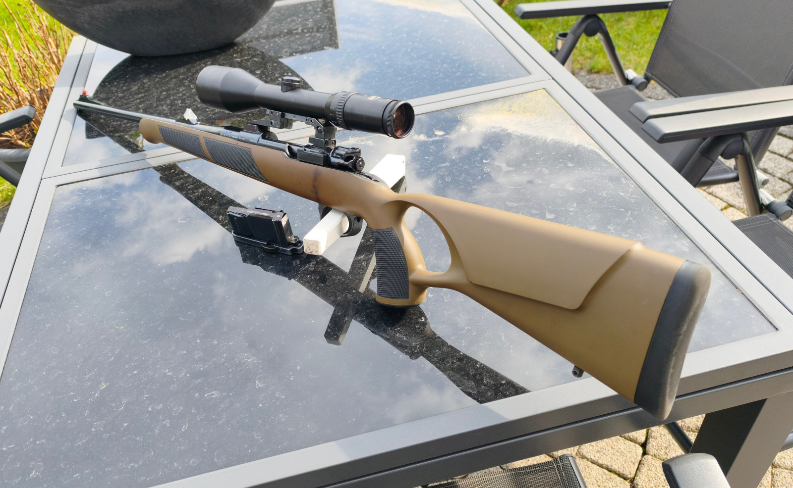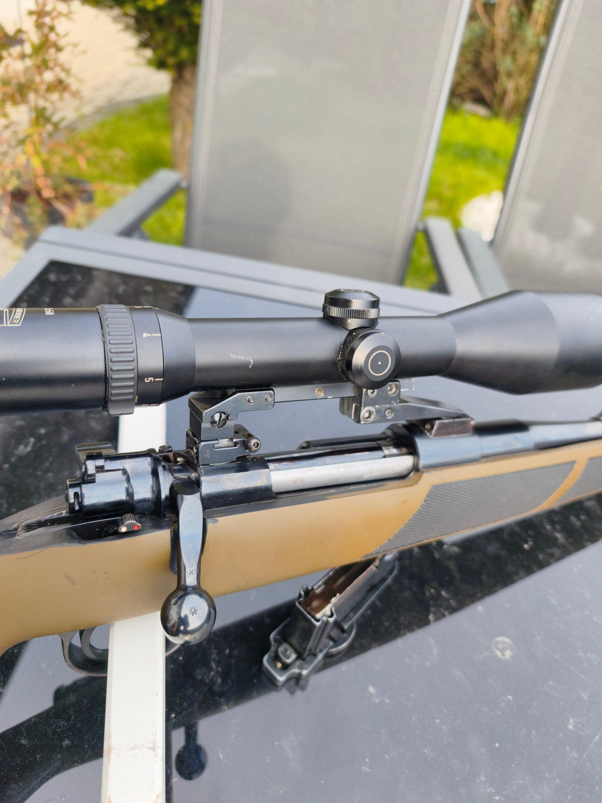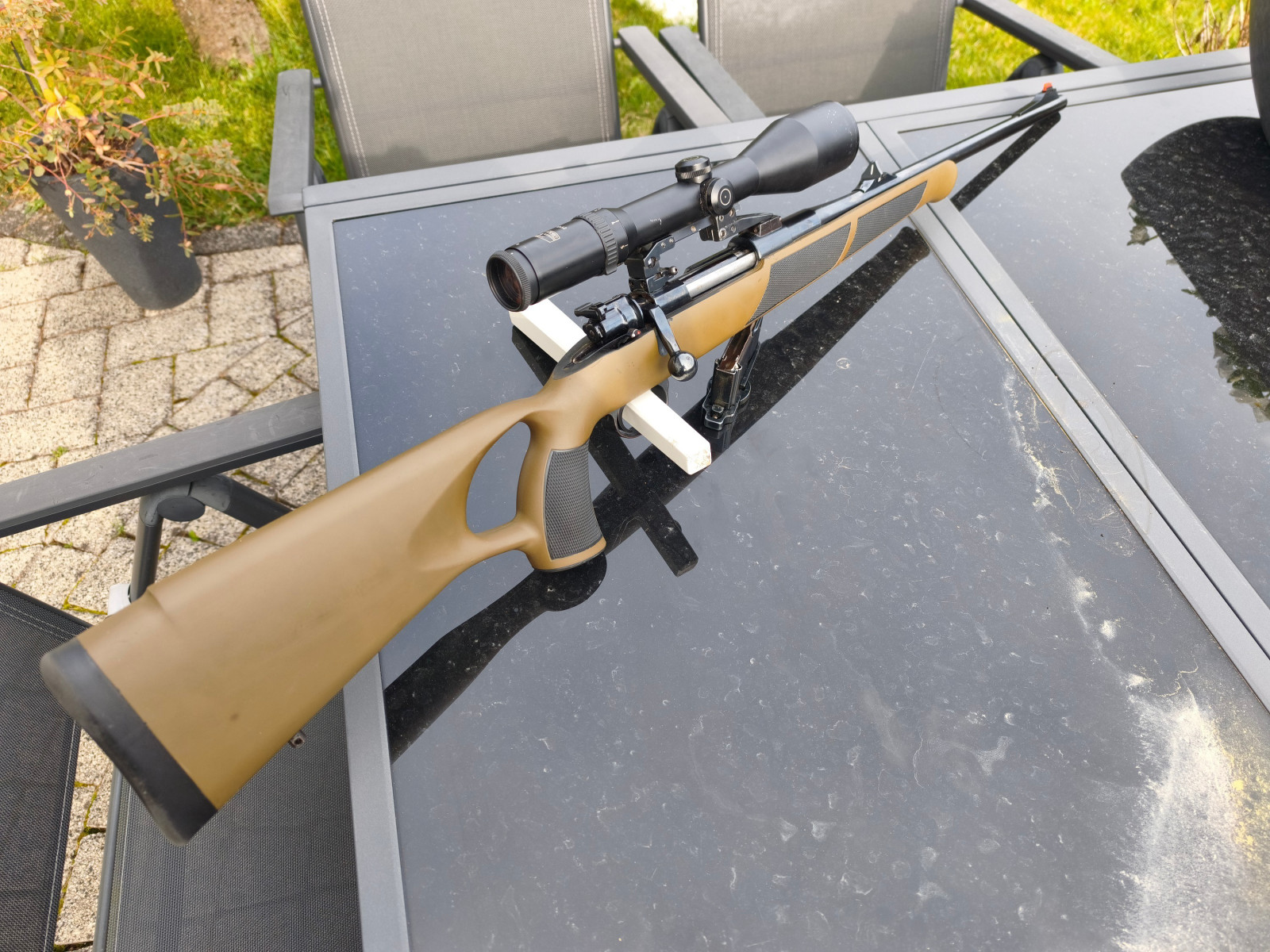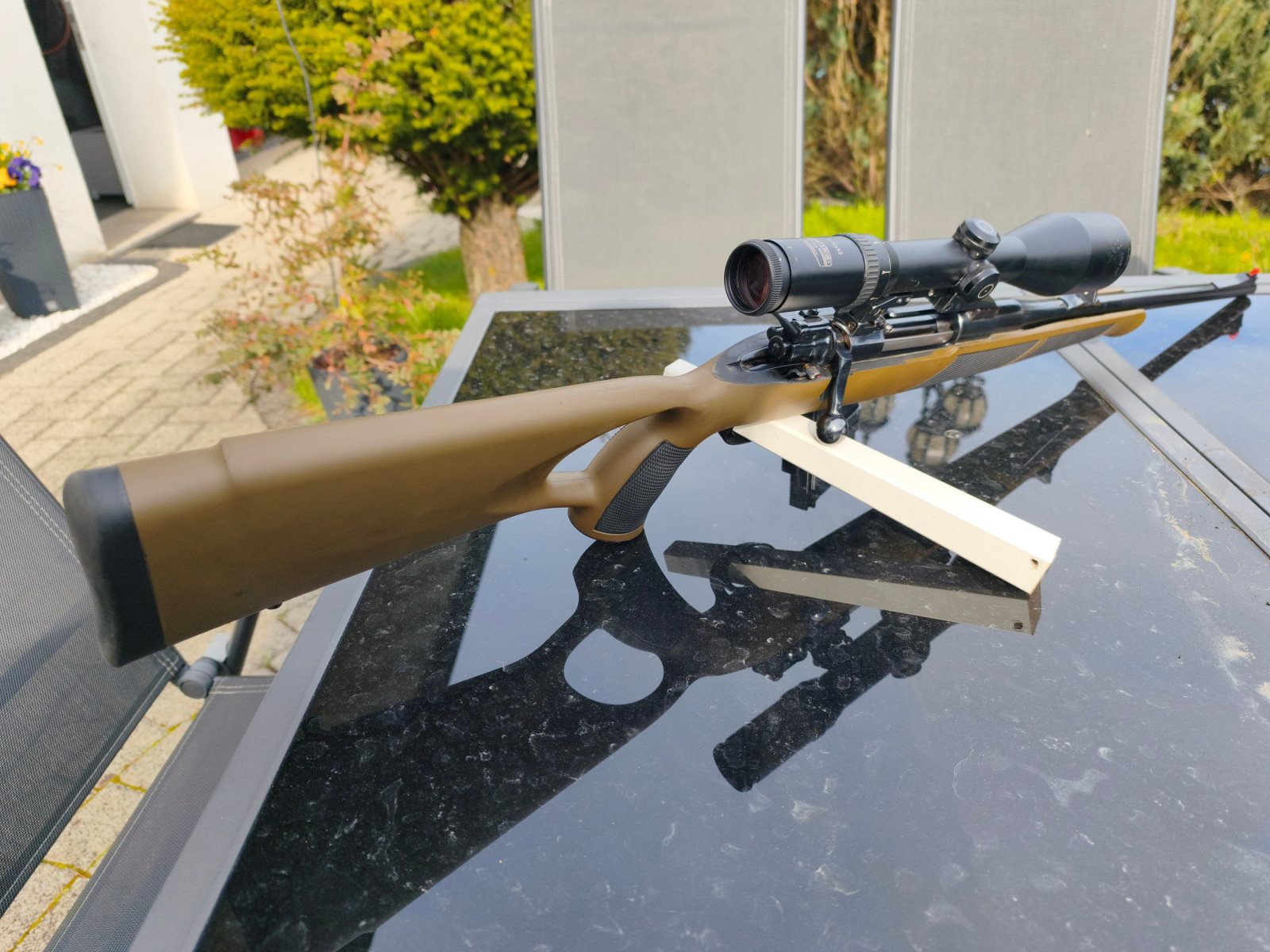 Ein besonderes Highlight ist der fein einstellbare Abzug (vermutlich Recknagel oder Timney) in Kombination mit einer Pirschsicherung.