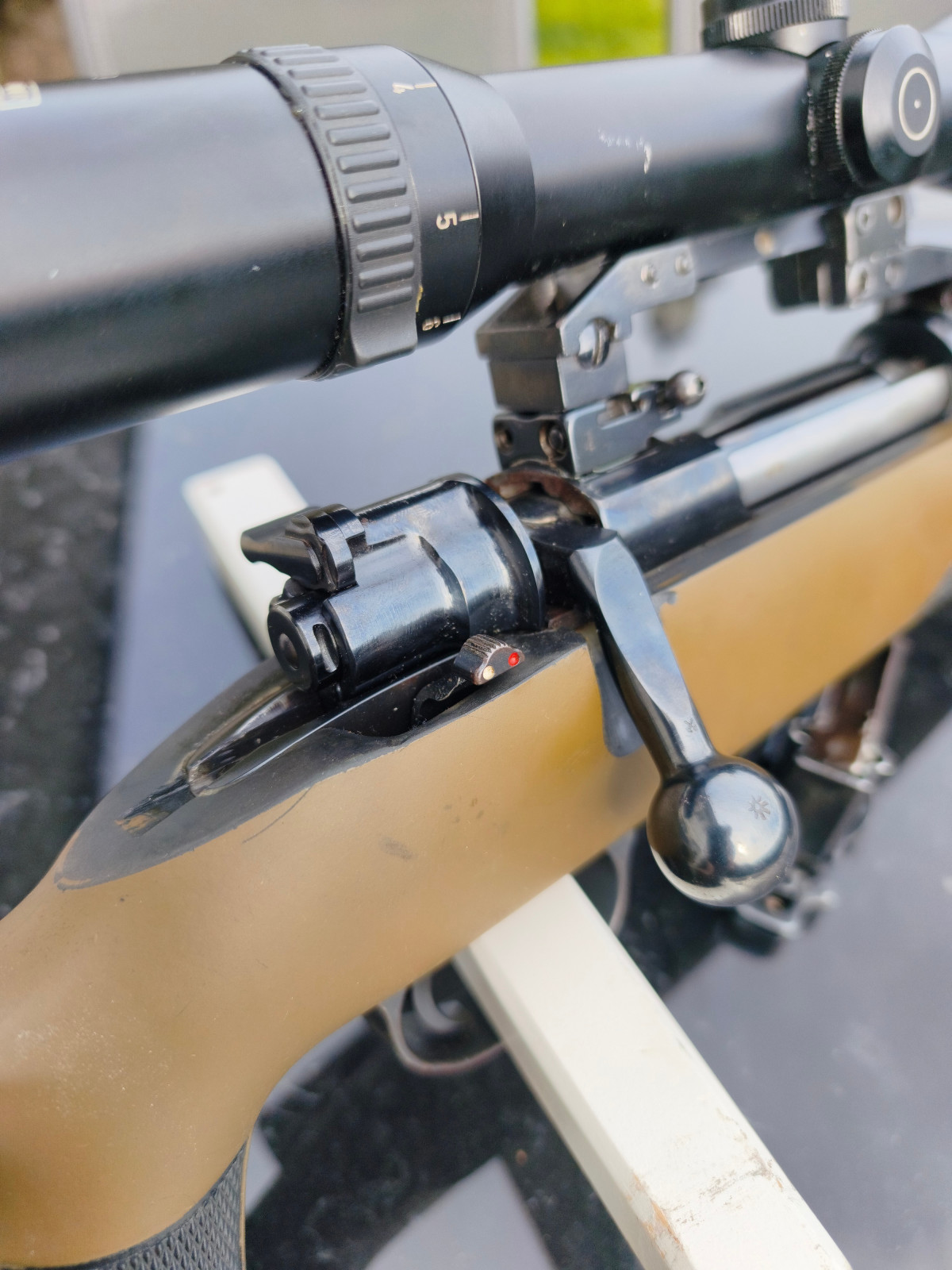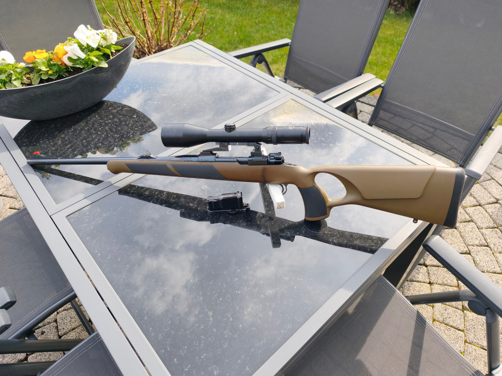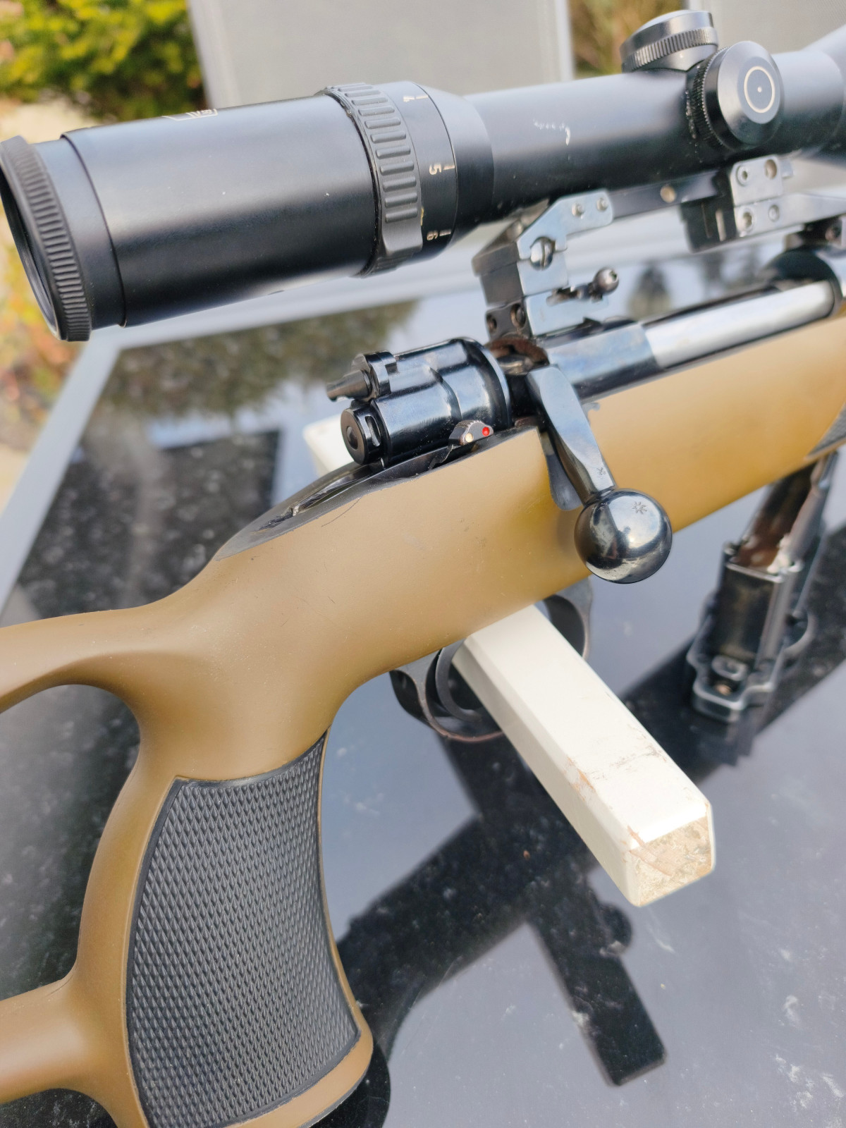 Ein besonderes Highlight ist der fein einstellbare Abzug (vermutlich Recknagel oder Timney) in Kombination mit einer Pirschsicherung.