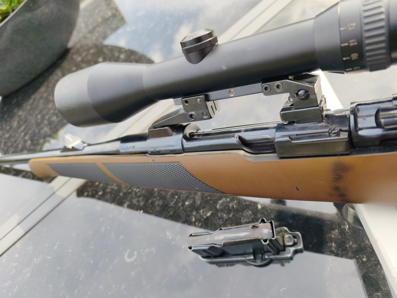 Ausgestattet ist die Waffe mit einer offenen Fluchtvisierung sowie einem hochwertigen Schmidt & Bender 3–12x50 auf stabiler Schwenkmontage. Das Zielfernrohr bietet ein klares, sauberes Bild.