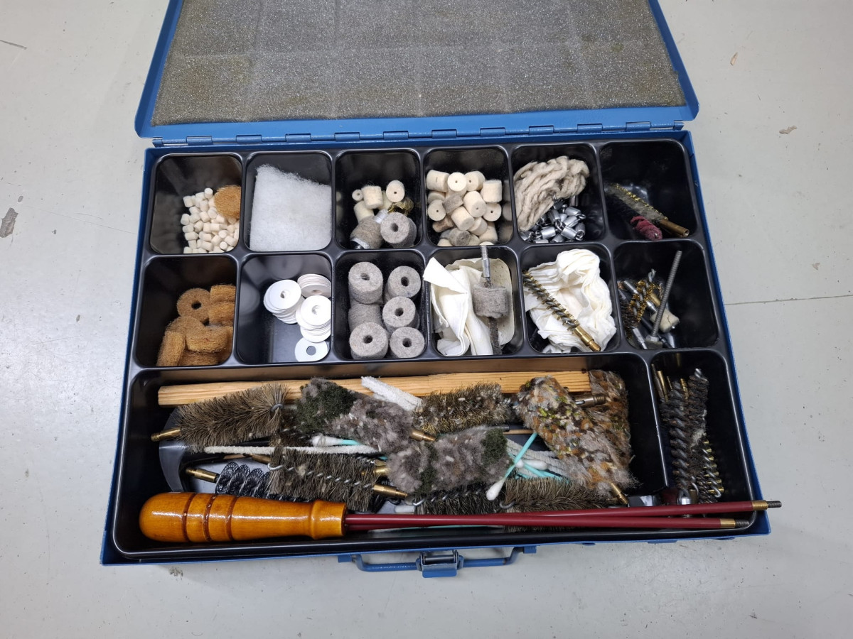 Konvolut Waffenreinigungszubehör aus Nachlass, inkl. Koffer wie abgebildet, neu oder zumindest neuwertiger Zustand/span>