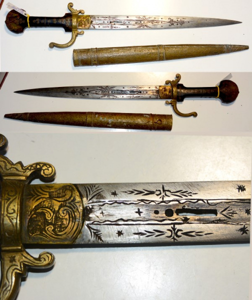 Kurzschwert mit 34,6 cm langer spitzer Klinge, Horngriff, Griff, Klinge und Scheide reich verziert. Ich vermute Balkan oder Asien