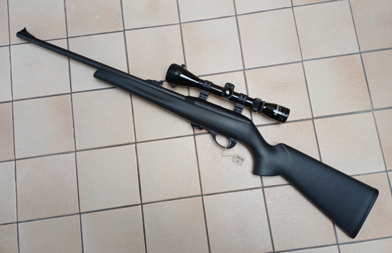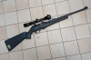 Sie bieten auf ein halbautomatisches Gewehr im Kaliber .22 l.r. aus der ersten Fertigungsserie mit schwarzen Kunststoffschaft, 10 Schuß Wechselmagazin und einem ZF 3–9 x 40 von Bushmaster. Die Standardvisierung ist im vollen Umfang vorhanden und auch die Kunststoffabdeckkappen für das ZF - lediglich die Verbindungsgummi haben die Zeit nicht überstanden.